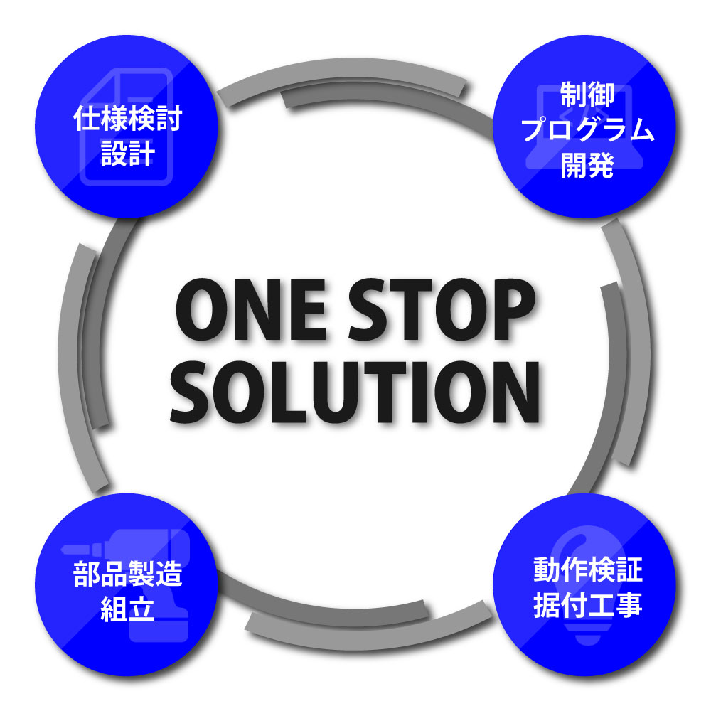 生産設備に関する課題を一箇所で完結できるワンストップ体制を確立しています。お客様からのご要望や現場の状況を丁寧にヒアリングした上で、仕様検討・設計から部品製作、組立、制御プログラム開発、動作検証、据付工事までを自社で一貫対応します。工程間の取りまとめや調整にかかる時間と手間を大幅に削減でき、短納期での導入が可能です。